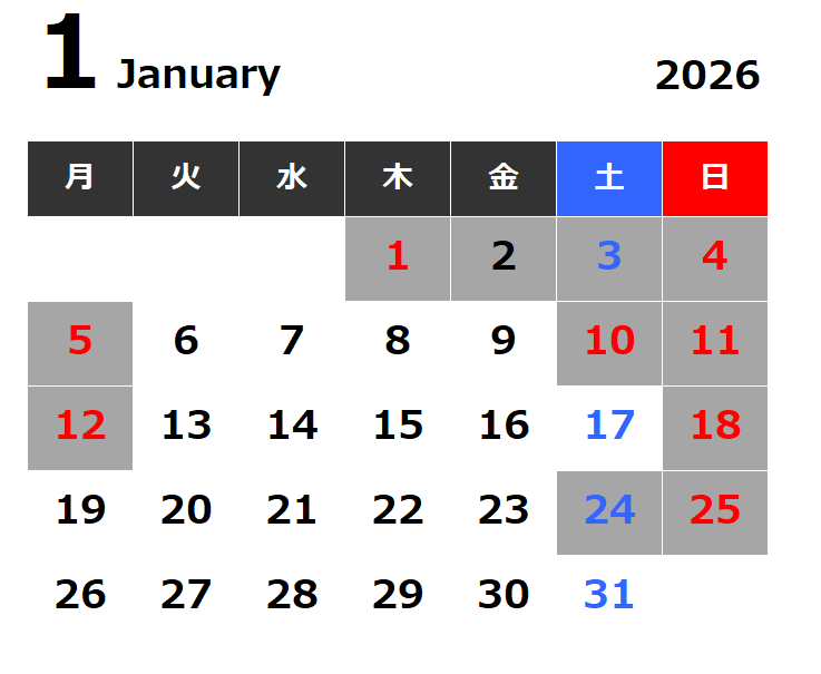 2026年1月 ふとん屋クガ 定休日と営業時間