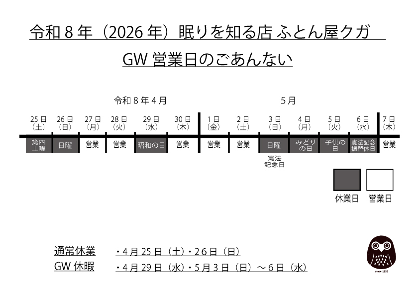 2026年 眠りを知る店 ふとん屋クガのゴールデンウィーク中の営業日は、上記の通りとなります。ご不便をお掛けしますが、どうか予めご了承ください。